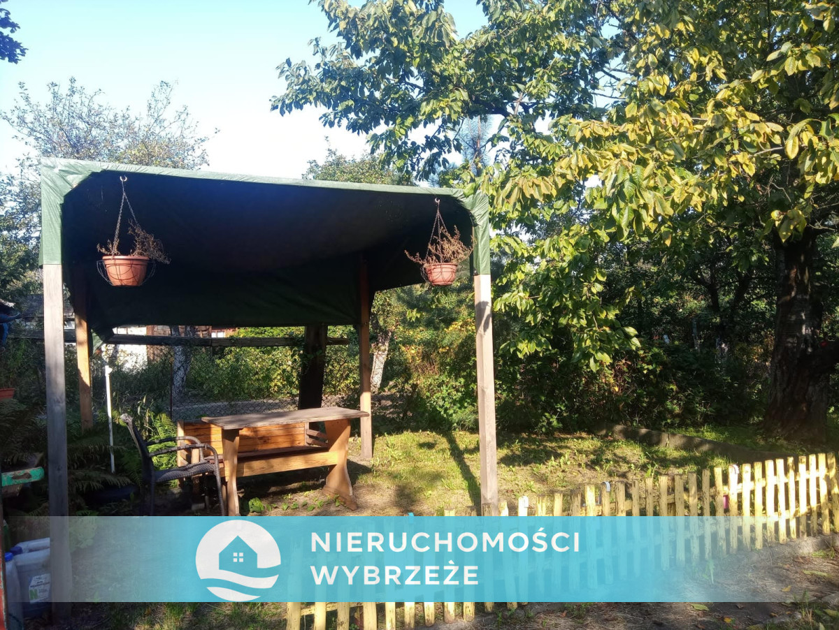 Na działce znajduję się domek drewniany z fundamentem betonowym oraz altana ogrodowa wyposażona w meble ogrodowe.