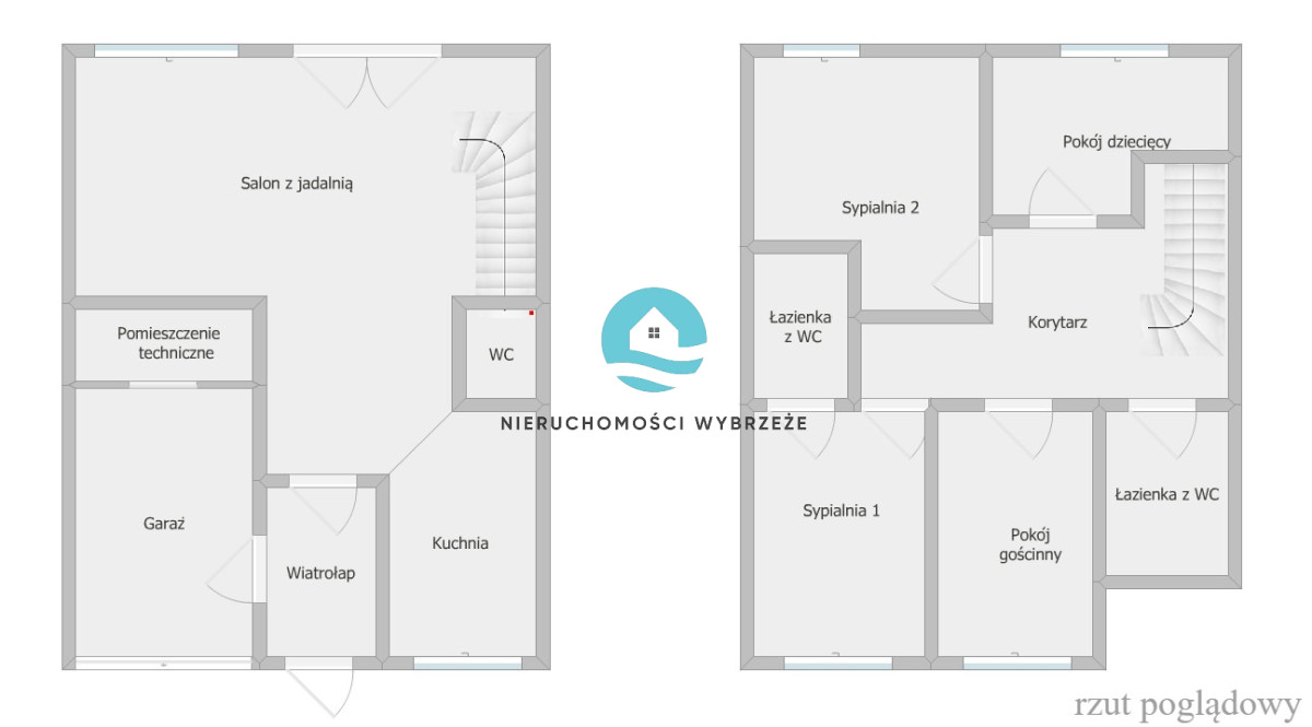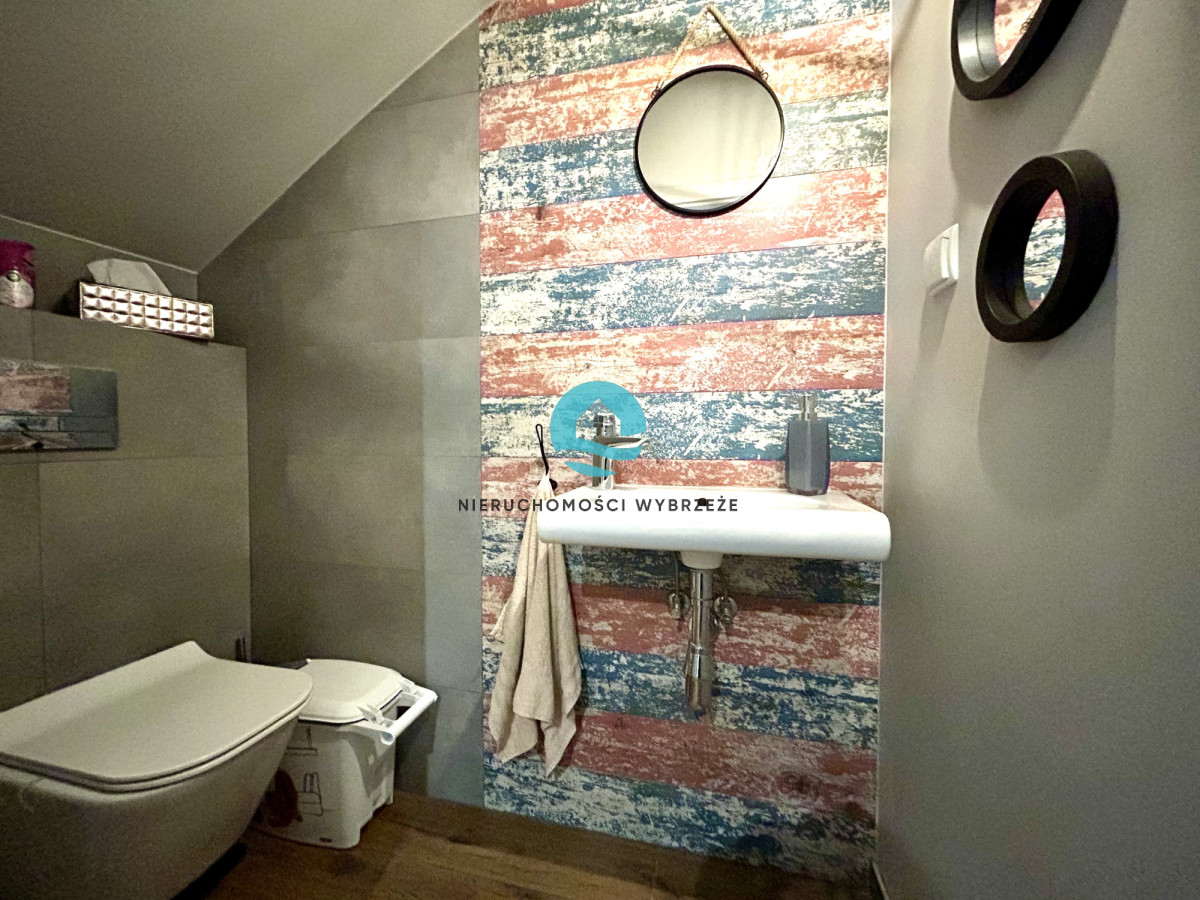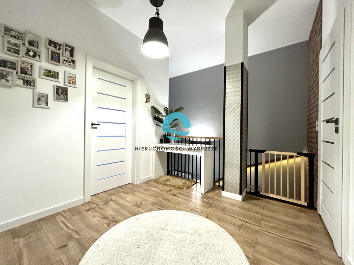 Piętro składa się z komfortowej łazienki z WC i prysznicem, przytulnej sypialni z własną prywatną łazienką (z WC i wanną), dużego pokoju, pokoju dziecięcego oraz dodatkowego pokoju gościnnego, który świetnie sprawdzi się również jako garderoba lub domowe biuro. Do dyspozycji jest także garaż na jeden samochód z pomieszczeniem gospodarczym, zapewniający dodatkową przestrzeń na przechowywanie.